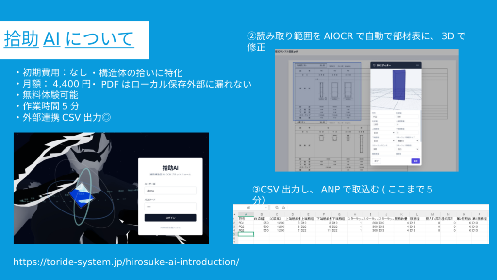 拾助AI(ヒロスケAI)は、AIによる断面読み取り、システムによる基礎伏せ図・平面図読み取りによって、BIMより圧倒的に簡単に3Dモデル立ち上げ、積算数量出しを効率化する最新ソフトです。