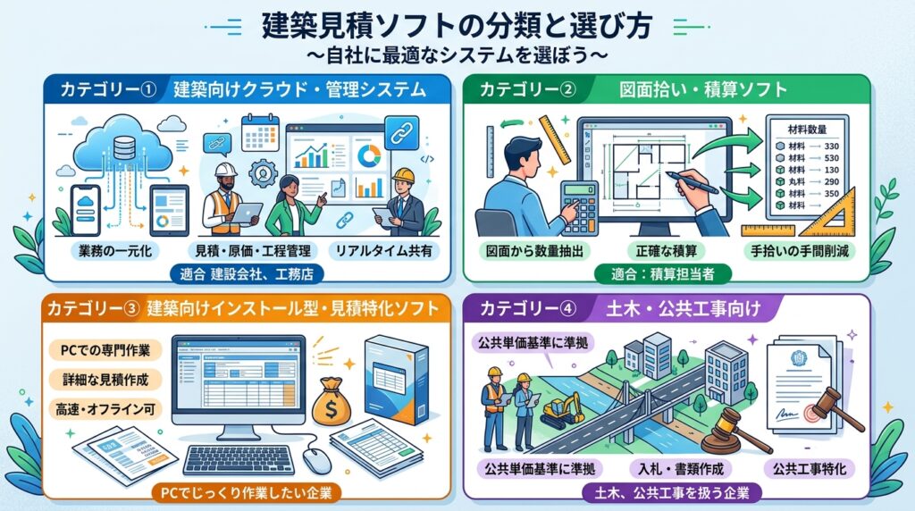 積算ソフトは大きく4つのカテゴリに分かれます。