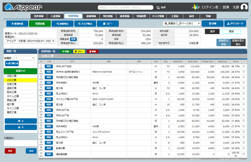 - 特徴: 見積作成に特化した「みつもり主任」と、予算・原価管理に対応した「よさん主任」の2製品で構成。用途に合わせて使い分けることができ、小規模工務店から中堅会社まで幅広く対応している。